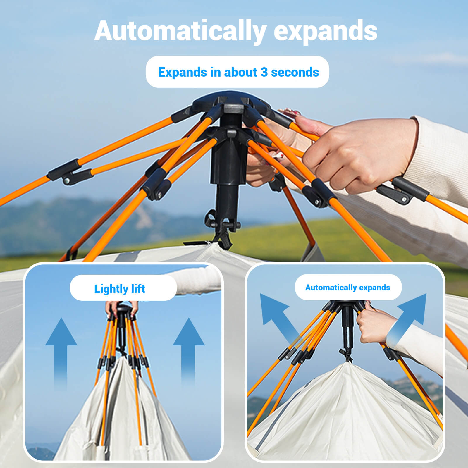 It uses a pre-assembled frame that automatically expands for instant setup.